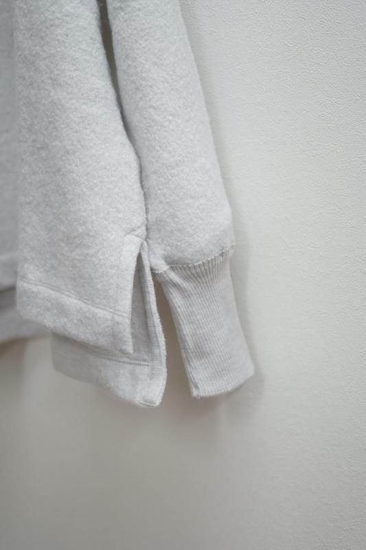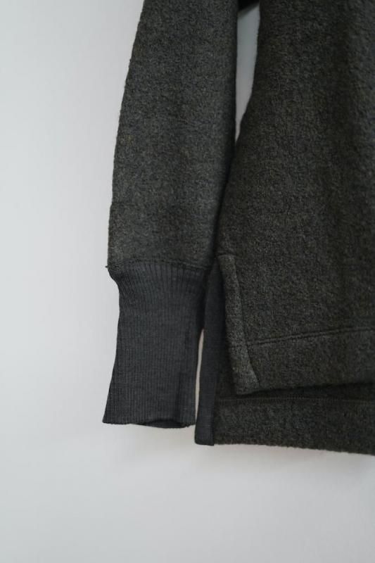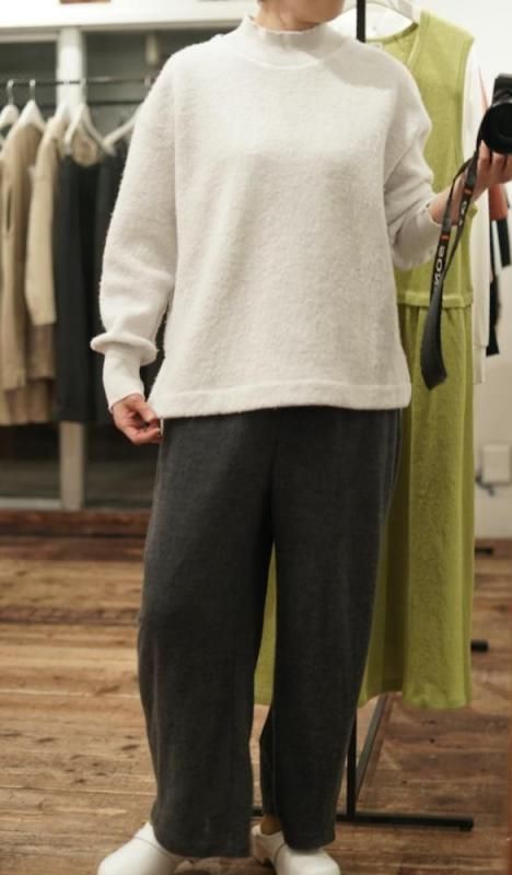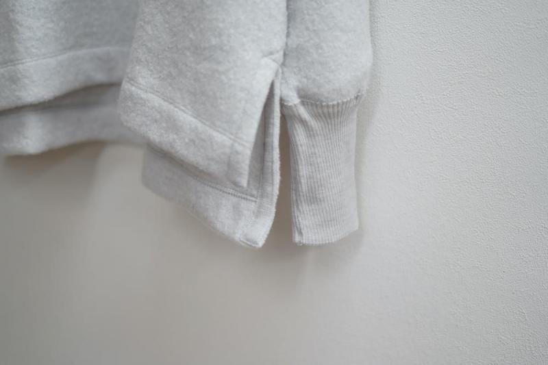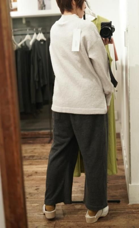 共糸で編み立てた襟とお袖のリブがアクセントとなりどこかルーズで抜け感のある仕上がりです。身丈は前後で長さが違いお尻が半分くらい隠れるデザイン、裾の両脇にもスリットが入りますので動き易さもあります。