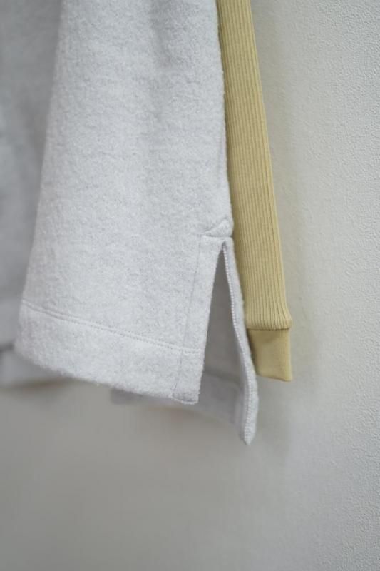 1/48.2/48の太さの違うウールトップ糸を引き揃え、凹凸のある梨地のような編み立て組織で縮絨をかけた素材です。